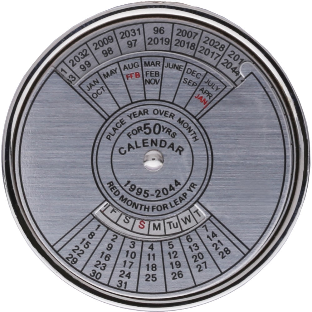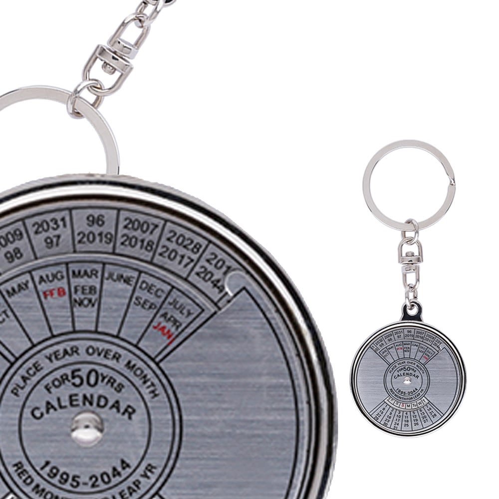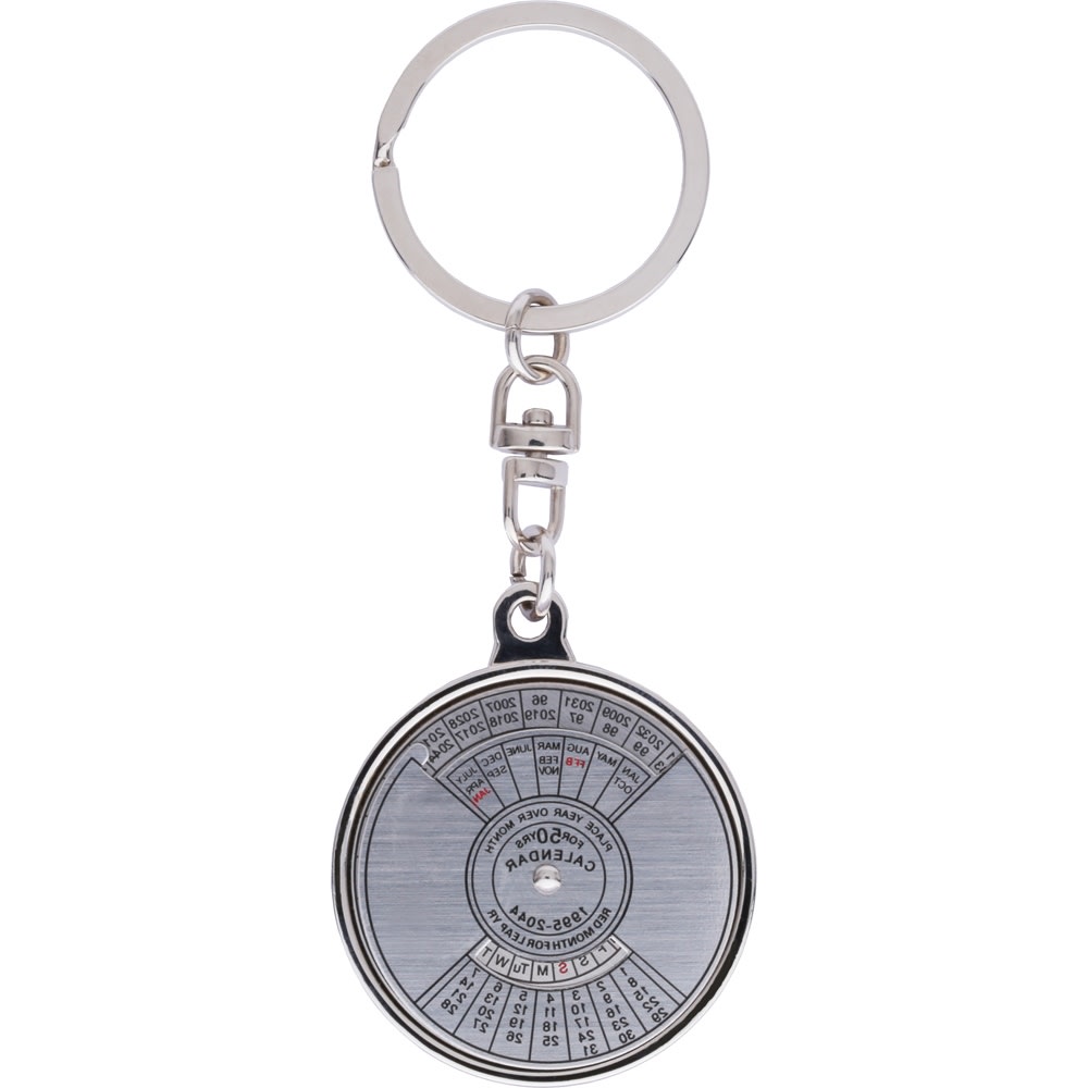 Keep your dates with this metal 50 year perpetual calendar keychain. Simply rotate to align the month and year at the top and the corresponding calendar appears at the bottom.