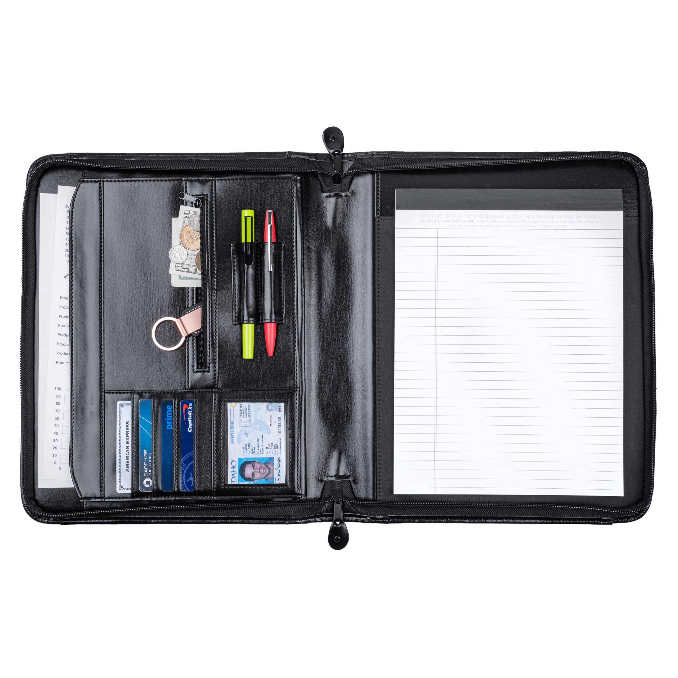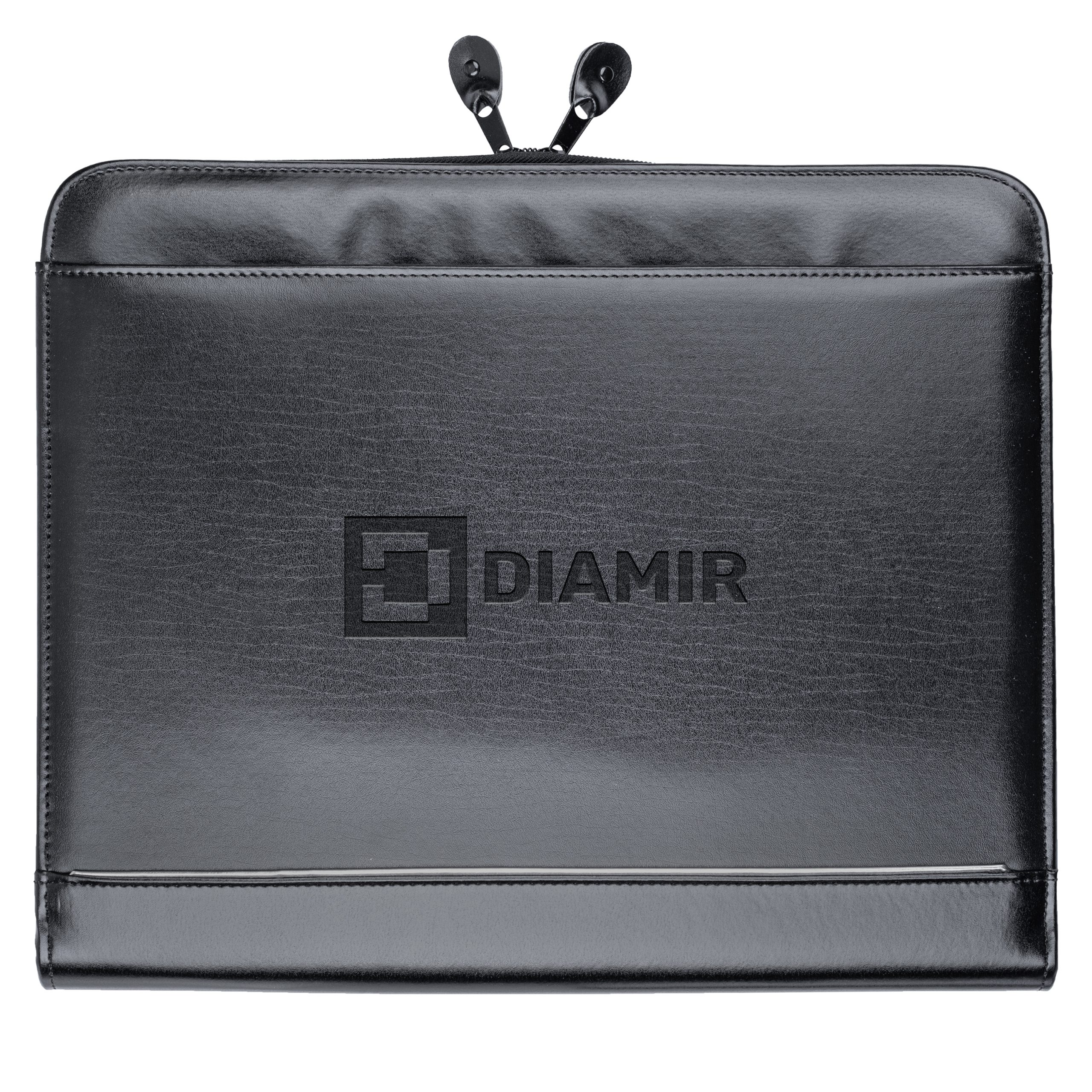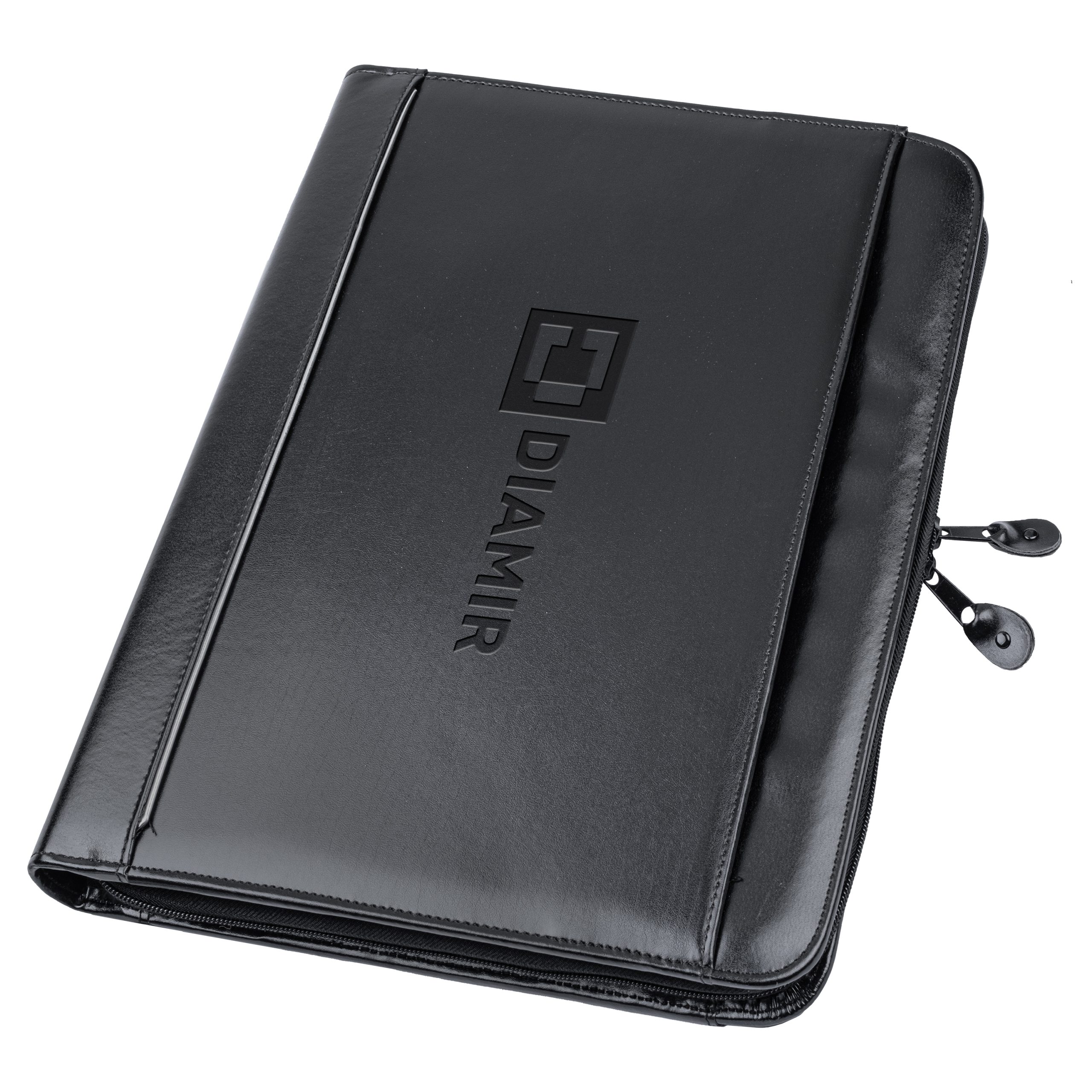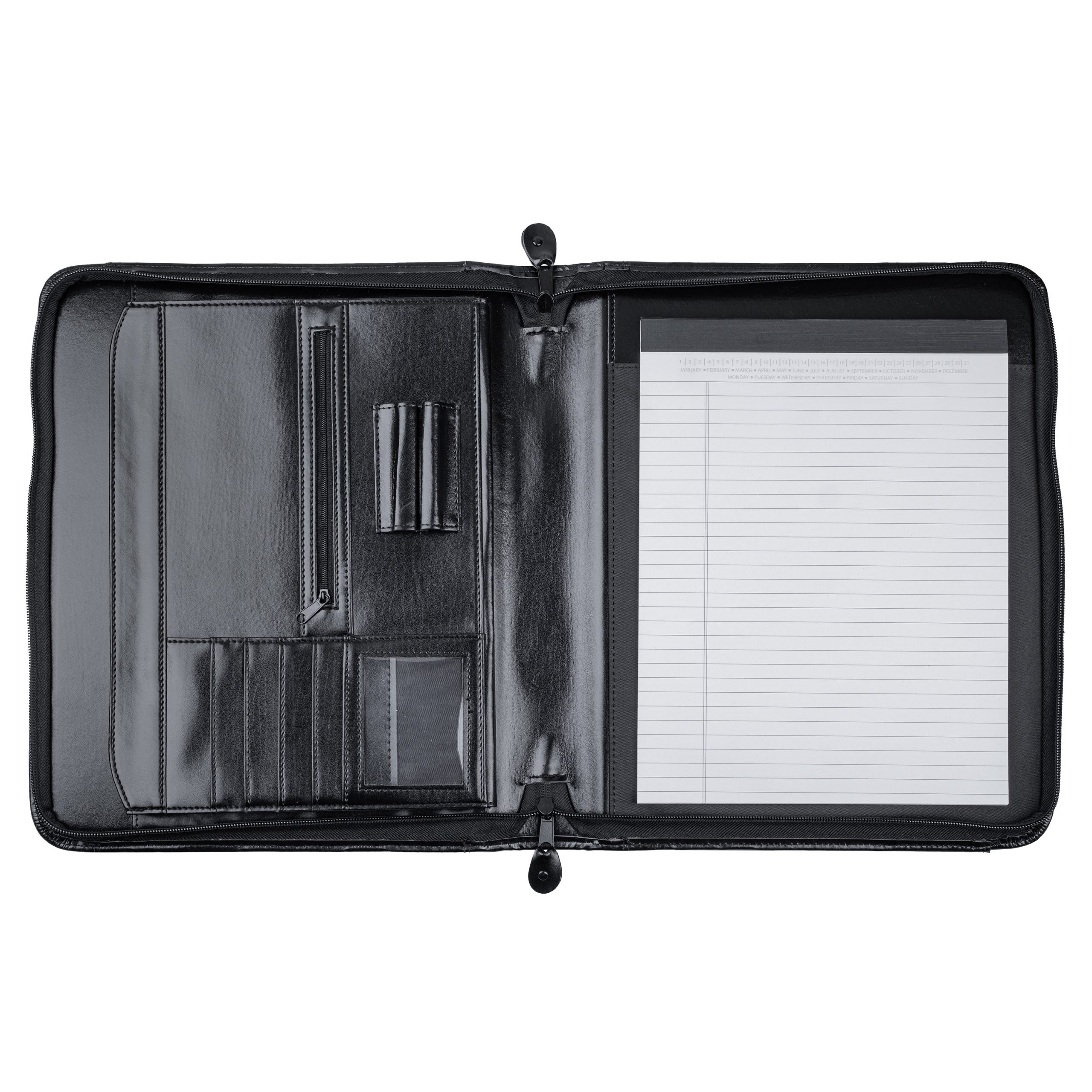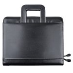 This zipper portfolio is the perfect balance between a briefcase and a folder. The exterior features retractable handles, a front slot pocket and a zipper closure to keep everything secure. On the interior, it features an open gusseted file slot, an interior organizer with business card slots, an 8-1/2â x 11â memo pad and pen loop. Made of simulated leather.