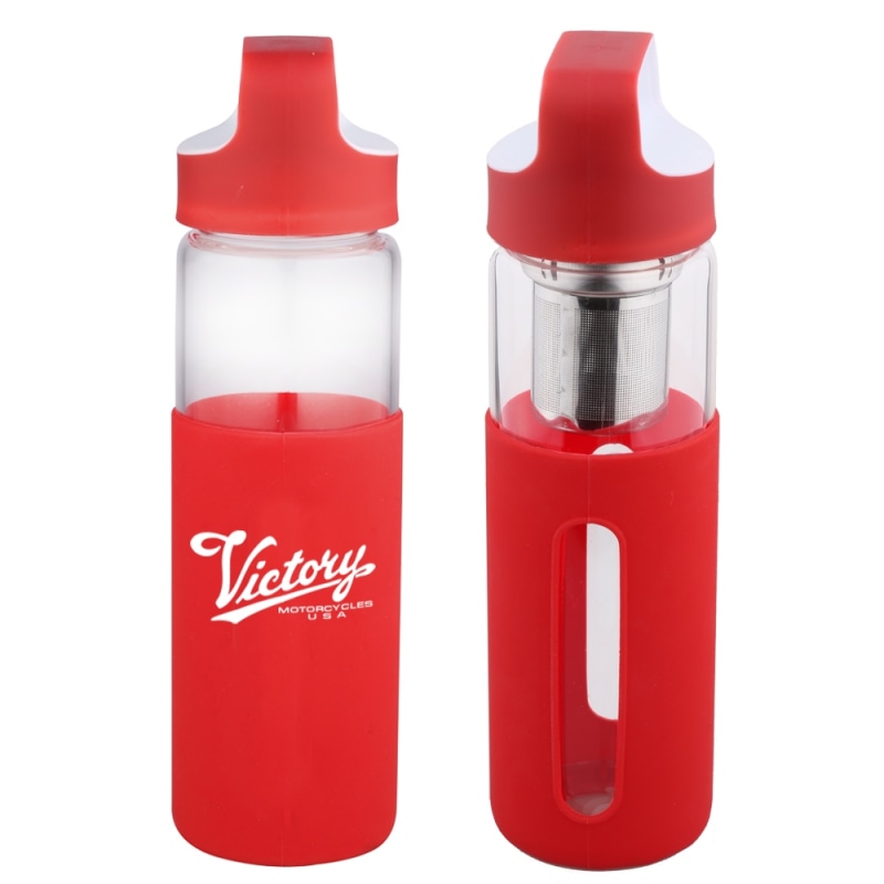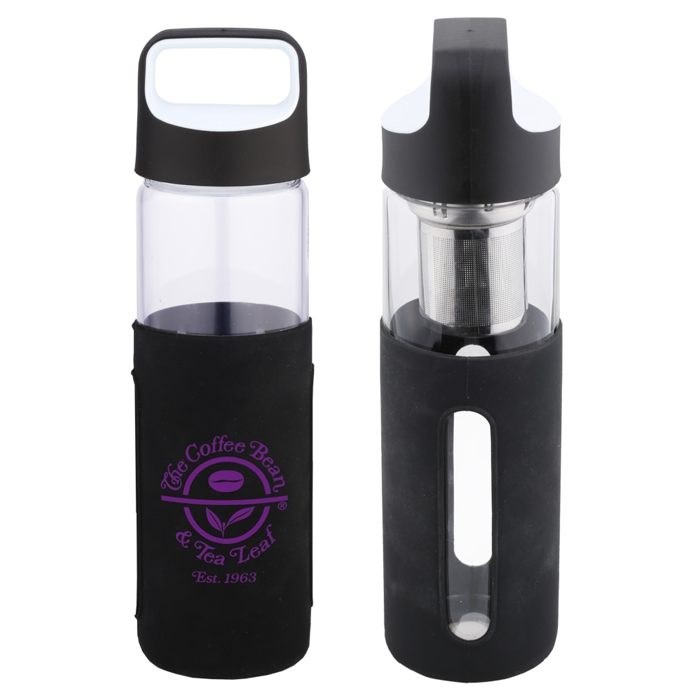 Enjoy your favorite tea in this 16 oz borosilicate glass bottle with silicone sleeve.The imprintable, silicone sleeve will add to the comfort when drinking a hot beverage. Add an optional, removable tea strainer to filter your favorite tea. *Add an optional tea strainer for $2.00(R)