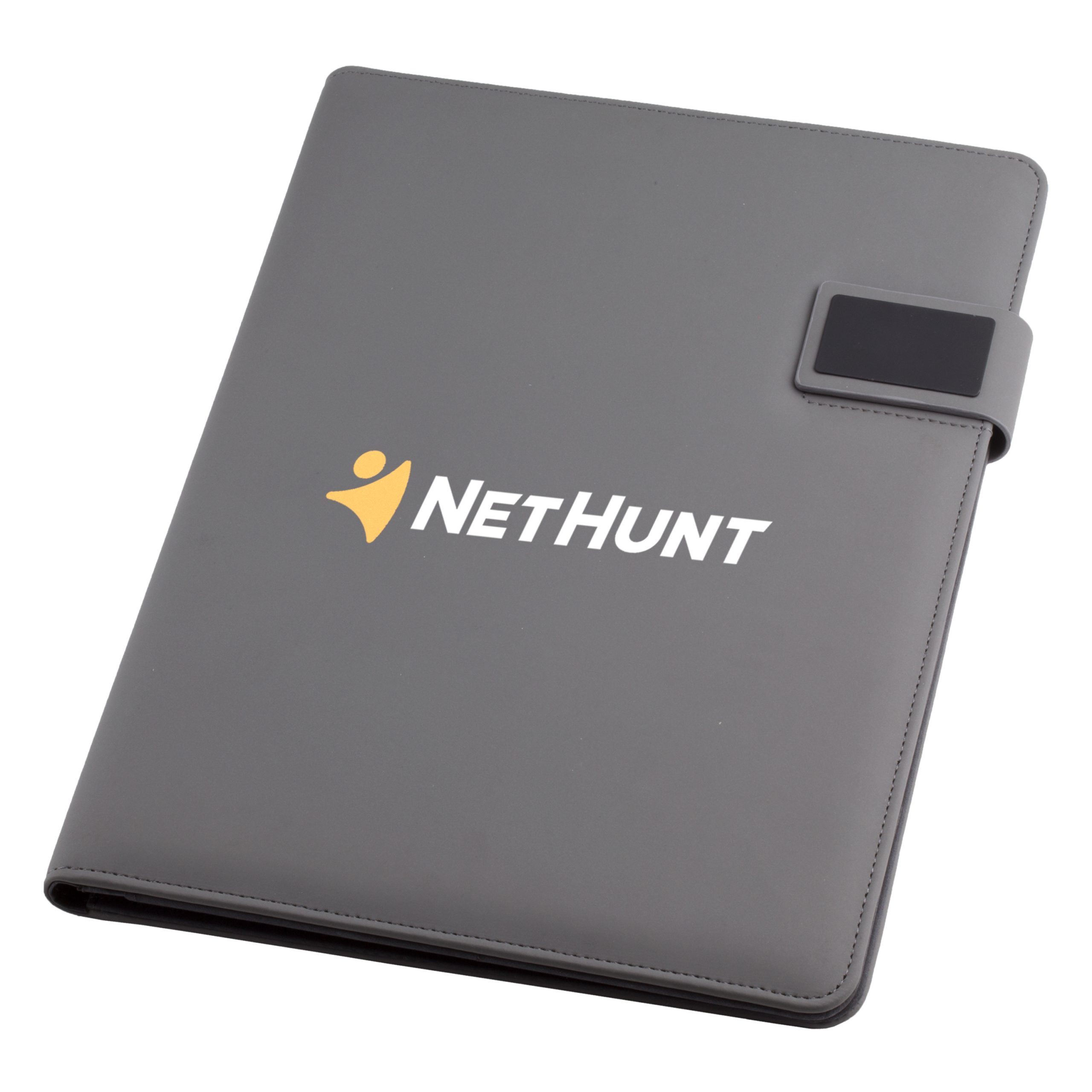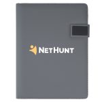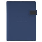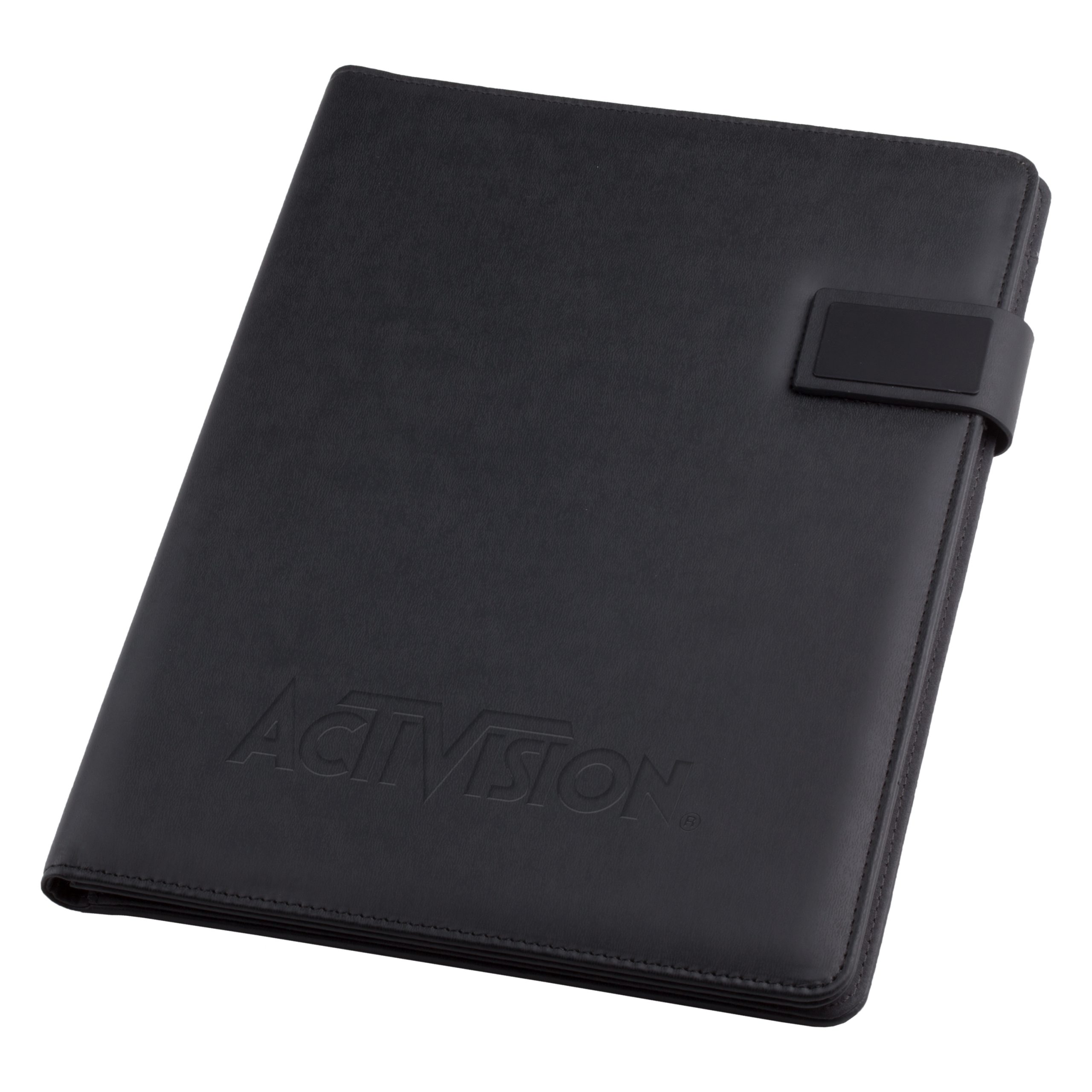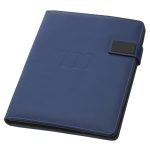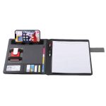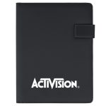 Highlighted by its magnetic button closure, this slim-line padfolio includes an 8-1/2″ x 11″ writing pad, an interior organizer with slots for business cards, a clear ID window pocket, file and pamphlet pockets, fold up Velcro bracket phone and tablet stand, and a pen loop. Made of simulated leather. (Pen and Accessories Not Included)