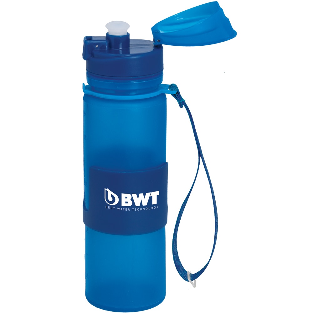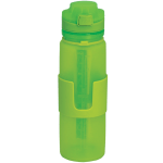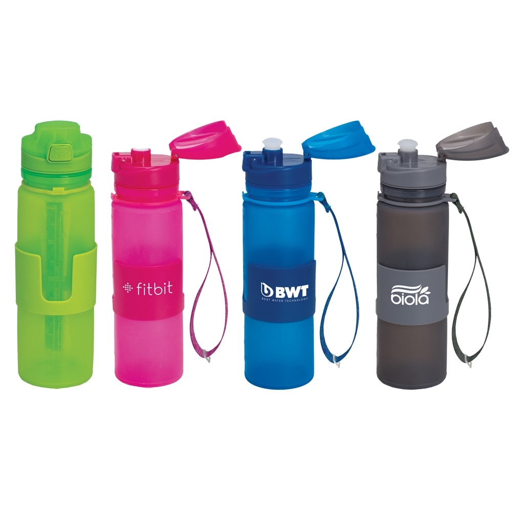 This collapsible silicone water bottle is perfect for on the go travel. The sanitary silicone keeps your beverages fresh and clean. Rollup the bottle and slide the lanyard over it for easy storage.