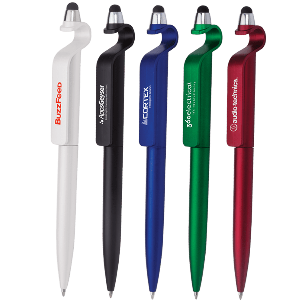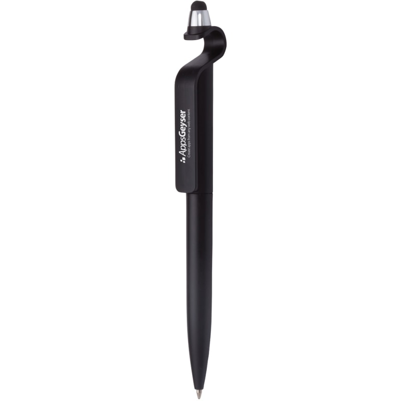 Twist-Action Stylus Ballpoint w/ Device Stand. This uniquely styled twist pen with stylus tip conveniently props up your phone for viewing pleasure. It also has a nice imprint area on the clip to proudly display your logo.