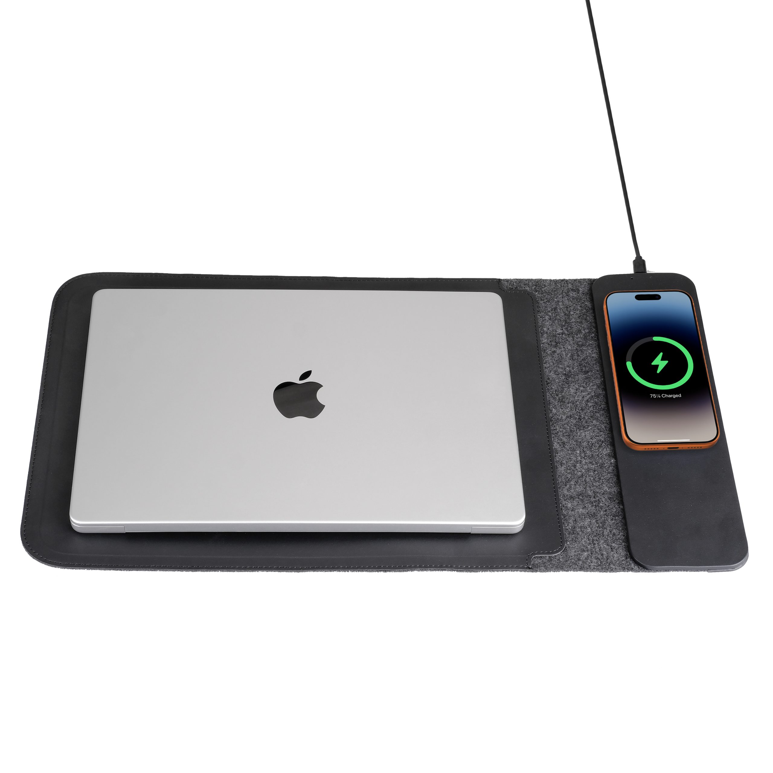 Set up your workstation anywhere without losing any productivity or comfort with this premium laptop sleeve and mat. The magnetic flap closure contains a magnetic wireless phone charger to keep you up and running wherever you are.